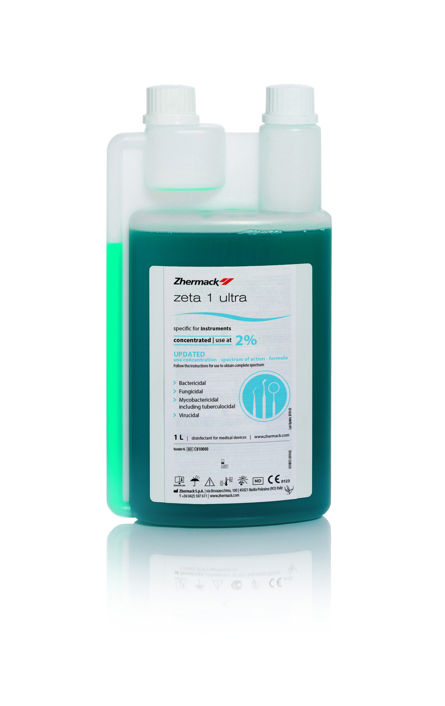 Dette yderst effektive produkt kan anvendes på to måder: En bred spectret desinfektion garanteres ved 2% opløsning for 60 minutter i almindelig kar eller i 30 minutter ved 35 grader C i ultralydskar. For hurtig og begrænset spektrum af desinfektion bruges 1% opløsning i 15 minutter i kar for at opnå bakteriedræbende, , yeastidale og begrænsede virucidale virkninger (HIV, HBV, HCV) 1 liter med 1% koncentrat = 100 liter brugsklar væske.